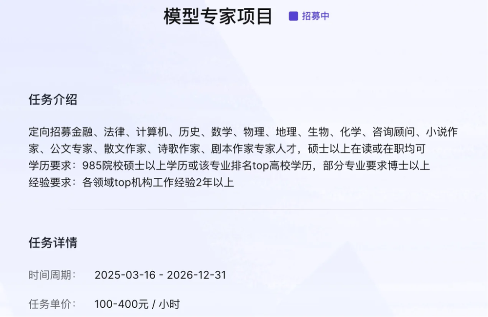 如今的门槛究竟卷到了什么地步?在某个标价100~400元/小时的“模型专家项目”招聘介绍中,要求几乎媲美大厂社招,卡985硕士的学历,卡高壁垒的专业背景,还卡2年以上的工作经验。