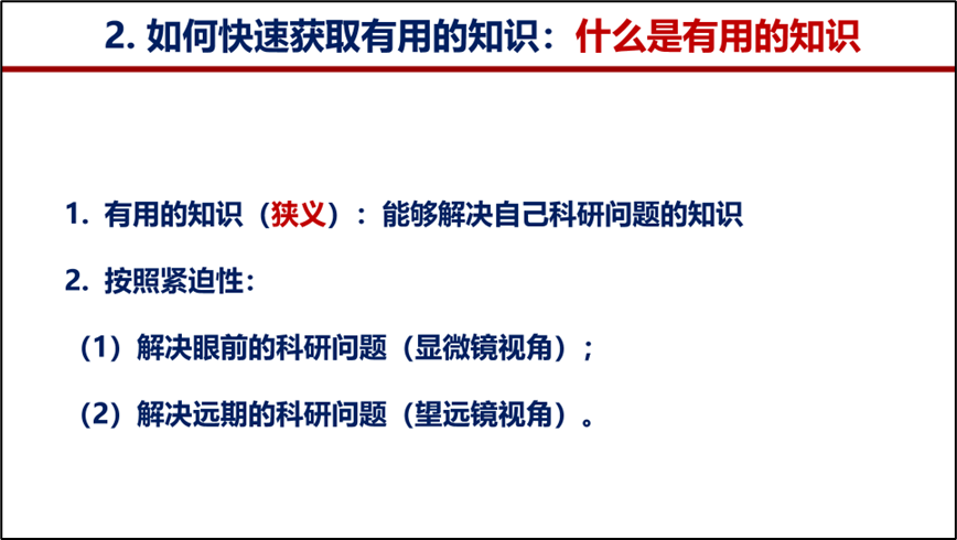 什么是有用的知识?一个非常狭义的定义是能够解决你自己的科研问题的知识就是有用的知识。因为研究生的就读时间非常短,科研问题也可能非常有挑战性,要努力去找到并积累那些能够解决科研问题的知识。