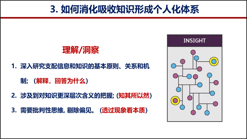 这需要我们对获取的知识有更深层次的把握。知识帮助我们知其然,再进一步的话,我们需要知其所以然,理解信息和知识的基本原则、它们之间的关系以及机制,这需要我们有批判性的思维来剔除偏见,换句话说:摄取大量知识之后,还需要我们透过现象看本质。