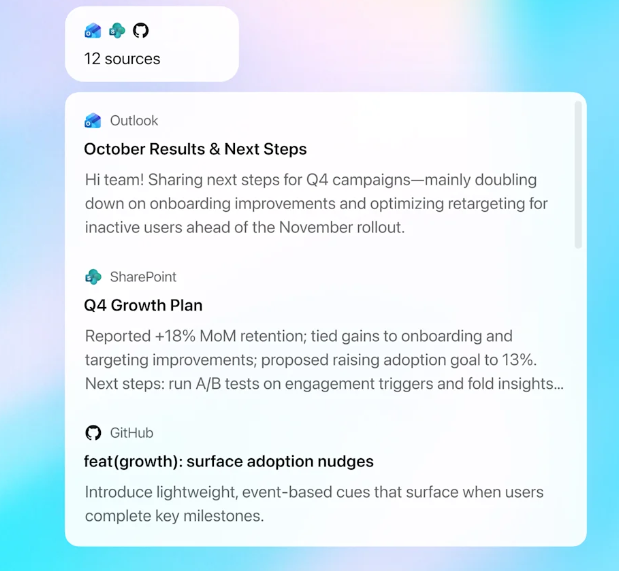 借助公司知识库功能,关联应用(如 Slack、SharePoint、Google Drive 及 GitHub)中的信息将变得更易获取、更有价值。该功能由经过训练的 GPT‑5 提供支持,可跨多源信息进行综合分析,提供更全面精准的答复。每条回复均附带清晰引文,以便你了解信息来源并信任结果。