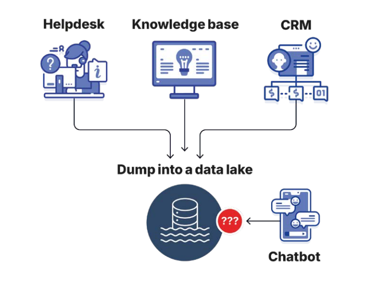 长期以来,知识管理领域解决信息孤岛的方案是统一检索:将所有信息归集至数据湖,再进行跨库查询。早期的 “通用” 聊天机器人沿用了这一思路,最终却以失败告终。脱离原始场景与系统的无差别内容毫无意义,基本无法为人工智能所用;此外,这种模式还存在权限规则难以迁移、信息更新不同步、交互仅能实现只读操作等问题。