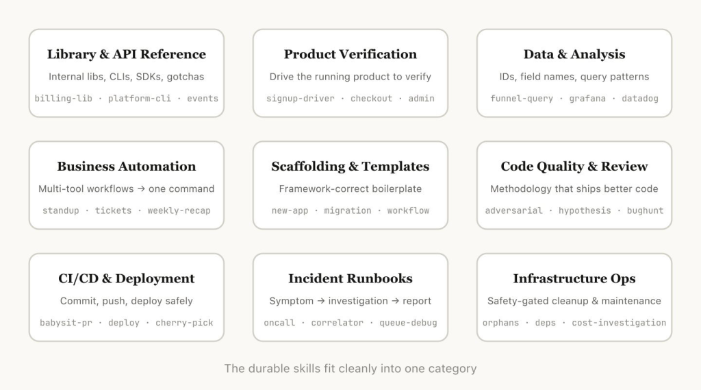 在梳理了我们所有的 Skills 之后,我们注意到它们大致可以归为几个反复出现的类别。最好的 Skills 清晰地落在某一个类别里;让人困惑的 Skills 往往横跨了好几个。这不是一份终极清单,但如果你想检查团队里是否还缺了什么类型的 Skills,这是一个很好的思路。