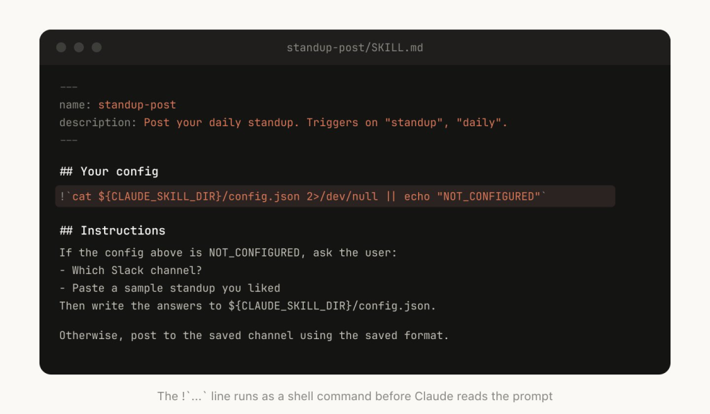 例如,一个 standup-post Skill 可以保留一份 standups.log,记录它写过的每一条站会汇报。这样下次运行时,Claude 会读取自己的历史记录,就能知道从昨天到现在发生了什么变化。