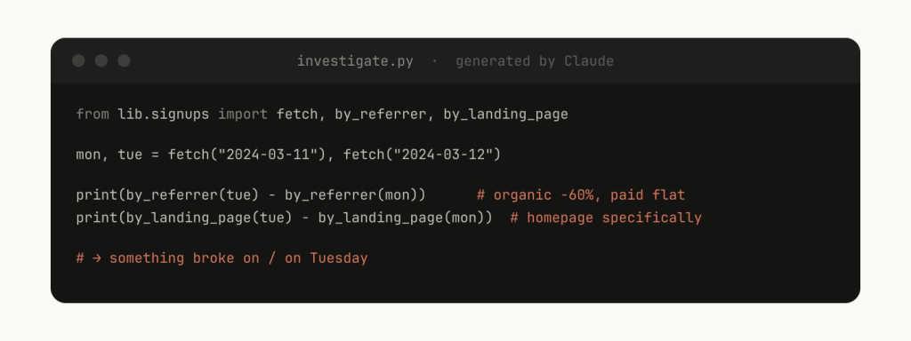 Claude 就可以即时生成脚本来组合这些功能,完成更高级的分析——比如回答“周二发生了什么?”这样的问题。