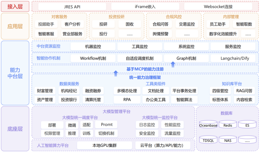 其中,“一体”指自主可控的大模型基座,是整个服务体系的核心,保障技术应用的自主性和安全性;“四翼”对应对客服务、投资投研、合规风控、内部管理四大核心业务领域,全面覆盖公司关键业务环节。