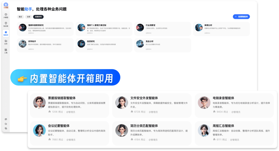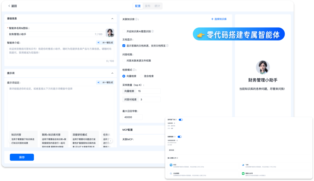 360AI企业知识库产品内置6大知识智能体、5个深度研究智能体以及21个MCP服务,让企业跳过“从0到1开发AI能力”的复杂过程,直接迈入“从1到100快速复制场景价值”的阶段,加速AI在各行业的规模化应用。智能体具备丰富的互动形式,图文、网页、表单、图表,用户可以用各种不同形式与智能体互动。