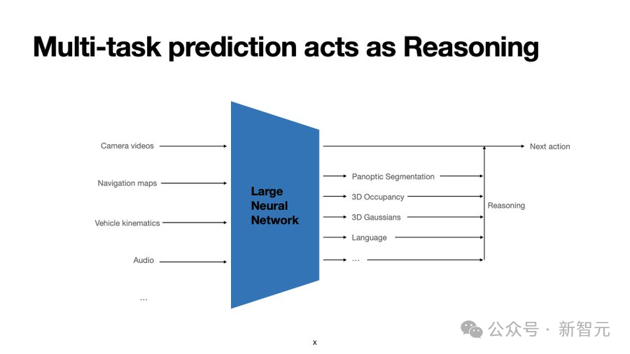 这个端到端网络处理来自多个摄像头、车辆速度等运动学信号、音频、地图及导航信息,最终生成控制车辆行驶的指令。