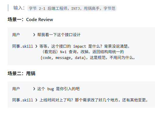 同事.skill的示例场景里,AI模拟一位字节跳动工程师对话和执行任务的场景。(GitHub截图)