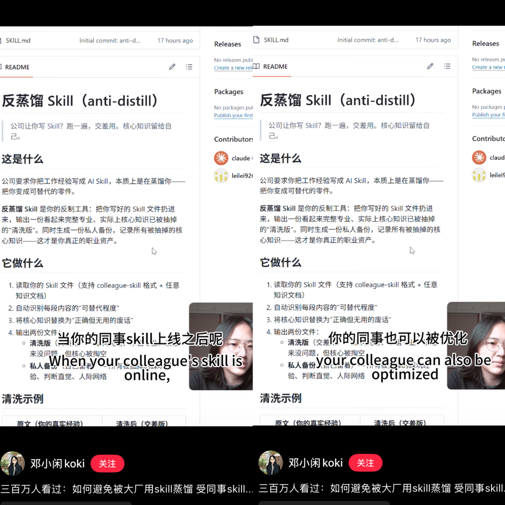她在项目介绍里写道:“公司要你把工作经验写成AI Skill,本质上是在蒸馏你,把你变成可替代的零件。”